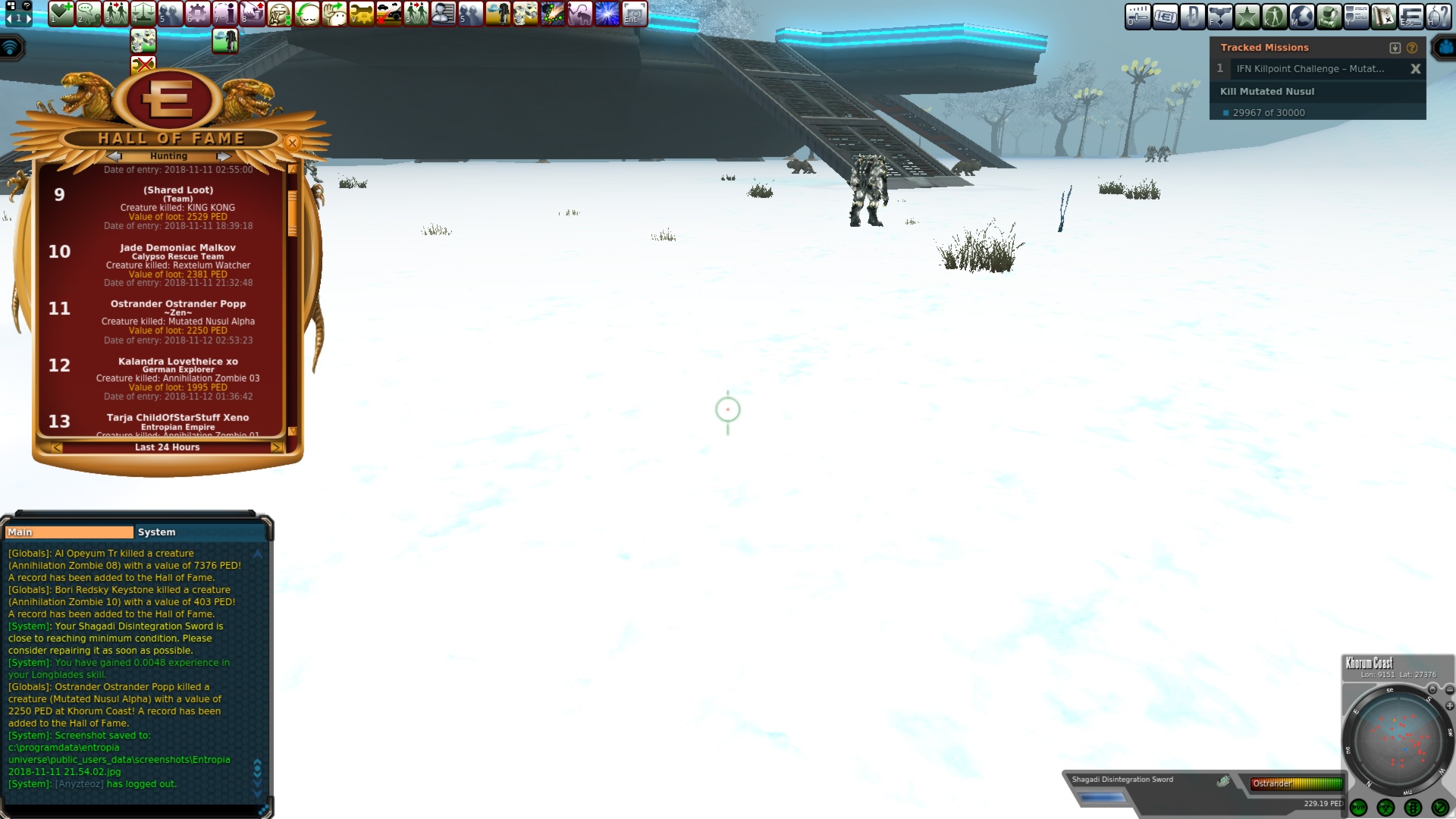 All hunters that have outstanding payments can still contact me to retrieve their rewards provided that they contact me before the end of January 2019. No rewards will added from today (19 December 2018) 21:40 Entropia Universe time.